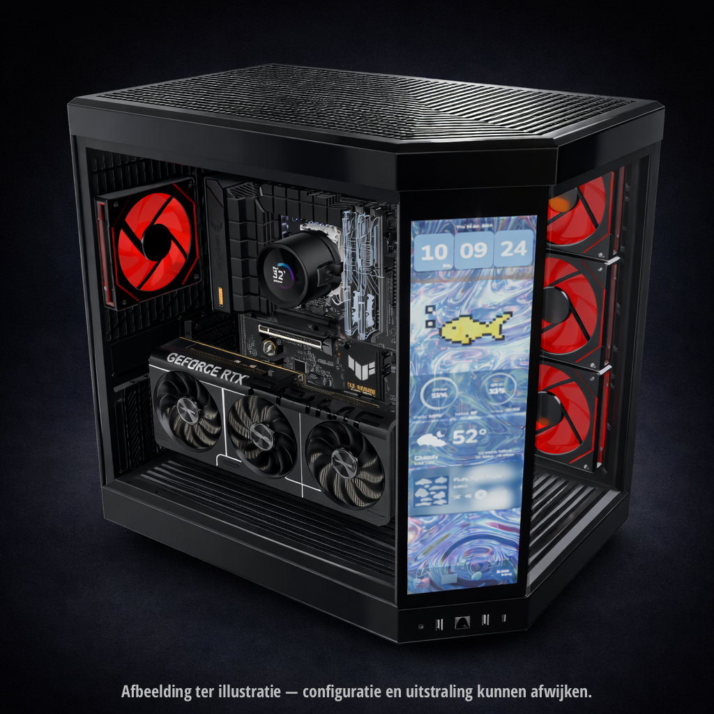Gebouwd in de HYTE Y70 Touch Infinite Pitch Black met geïntegreerd display biedt dit systeem een sterke balans tussen prestaties, workflowcapaciteit en een minimalistische zwarte uitstraling.